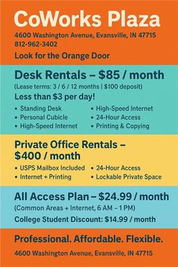 Enjoy high-speed internet, private meeting rooms, modern amenities, and flexible memberships — all in the heart of downtown Evansville. Here, work feels less isolated and more inspired.